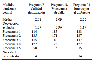 La población calificó de “regular” la calidad de iluminación natural de sus viviendas con una media de 2.78. Esto se relaciona con una aparente necesidad de mayor número de focos (pregunta 5). La media de la frecuencia mensual de fallas eléctricas fue 2.09, por lo que se entiende que la calificación del servicio del gobierno no haya sido alta. La media de la pregunta 21 (2.56), indica que la población encuestada tiene poco interés por el ambiente.