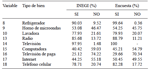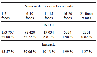 Se pone en evidencia de la pregunta 12, que la población no tiene como prioridad el uso de la electricidad como medio de preparación de alimentos, al igual que la posibilidad de que el poder adquisitivo no permita adquirir otra clase de estufa debido al costo más elevado. Por otro lado, todas las viviendas de la muestra tienen televisión y radio. La gran mayoría tiene licuadora, lavadora, microondas y refrigerador. Y poco más de la mitad tiene acceso a computadora, televisión de paga e internet (Fig. 1). Estos son indicadores del nivel de marginación. No obstante, estos datos indican que la población muestreada considera que sus necesidades de entretenimiento así como de comodidad son importantes, incluso por encima de la capacidad adquisitiva. Hay viviendas que tienen televisión, pero no tienen refrigerador (Cuadro VIII). Los resultados de la variable relacionada con la cantidad de focos en la vivienda corresponden con la información oficial obtenida por INEGI (2015; Cuadro IX).