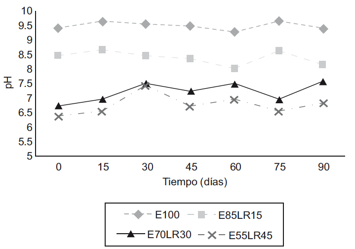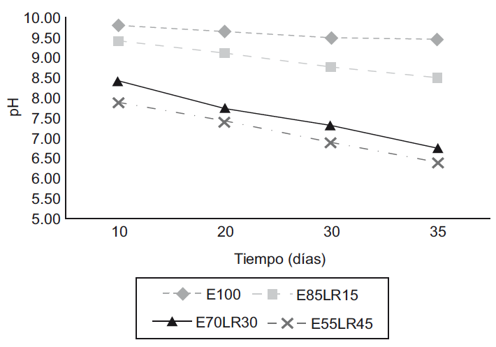 El cambio en el pH a través del tiempo del vermicomposteo se vio reflejado en una ligera disminución de su valor en todas las vermicompostas (Fig. 2). Esto se relaciona con el contenido de material de origen adicionado; es decir a mayor porcentaje de LR, menores valores de pH. Las vermicompostas que tendieron a la neutralidad fueron E70-LR30 y E55-LR45. La tendencia de la disminución del pH concuerda con otras investigaciones reportadas (Garg y Kaushik 2005, Khwairakpam y Bhargava 2009) y se explica debido a los procesos de óxido reducción y producción de hidrógeno generados por bacterias anaerobias, de acuerdo con Gogoi et al. (2015). Las variaciones del pH hacia la alcalinidad en los tratamientos E100 y E85-LR15, se deben a procesos de mineralización, así como a la producción de CO2 durante el metabolismo microbiano, de acuerdo con Gómez-Brandón et al, (2013) y Gogoi et al. (2015). Estudios realizados por Gupta y Garg (2008) y Amouei et al. (2017) señalan que la estabilidad del pH utilizando lodos residuales se consigue a partir de los 75 días, aunque en esta investigación se observa que la estabilización se dio a los 60 días. Por lo tanto, el efecto de la lombriz durante el vermicompostaje probablemente se relaciona con incrementos en el contenido de nitrógeno mineral de los sustratos, los cambios en el equilibrio de nitrato-amonio y la acumulación de ácidos orgánicos, aunado al metabolismo microbiano o a la producción de ácidos húmicos y fúlvicos durante la descomposición (Hait y Tare 2011).