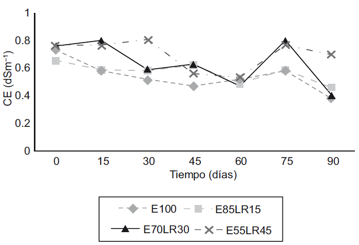 La CE fluctuó durante el proceso en todos los tratamientos debido a la descomposición de la materia orgánica. La CE se encontró en un intervalo entre 0.4 y 0.8 dS/m lo que indica valores bajos de salinidad. A los 75 días del proceso se presentó un incremento en la CE de las vermicompostas (Fig. 3), probablemente debido a la pérdida de MO durante la ingestión y excreción por las lombrices (Hait y Tare 2011) y la liberación de diferentes sales minerales en formas disponibles, tales como sales de fosfato, amonio y potasio, entre otras (Soobhany et al. 2015).