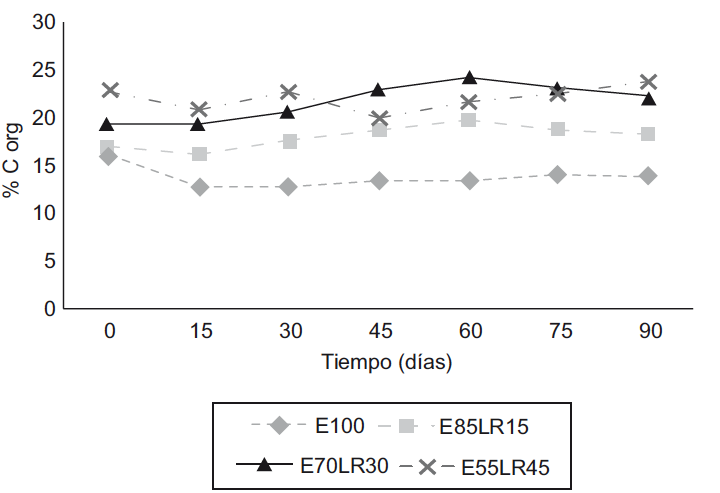En E55-LR45, el C orgánico aumentó después de los 60 días. Este comportamiento podría deberse que, al ser el tratamiento con mayor cantidad de MO, probablemente presentó una tasa más lenta de mineralización de C, sugiriendo que aún después de los 90 días se sigue mineralizando el C de origen más recalcitrante (Suthar 2009).