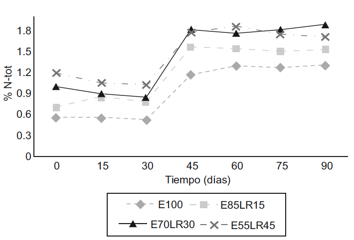 El N total aumentó considerablemente a los 30 días del proceso de vermicompostaje (Fig. 5). Los niveles de N aumentan mediante la adición de productos que excreta la lombriz como moco, fluidos corporales, enzimas y descomposición de tejido de las lombrices muertas (Suthar y Sing 2008, Suthar 2009). Este efecto de incremento del N depende principalmente del grado de mineralización y la cantidad total de N presente en el material de origen adicionado (Hait y Tare 2011). El contenido de N estuvo en función del LR y E que se adicionó a cada vermicomposta: a mayor contenido de LR, mayor contenido de N. El máximo contenido de N lo presentó la mezcla E70-LR30 al final del proceso de vermicomposteo.