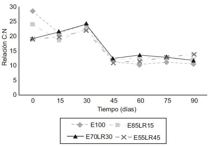 La relación C:N en todas las vermicompostas fue disminuyendo, siendo evidente a partir de los 30 días del proceso (Fig. 6), lo que demuestra el papel que juegan las lombrices en la descomposición y tasa de mineralización de la MO durante el vermicompostaje. Este cambio en la relación C:N refleja el grado de mineralización y estabilización de los residuos orgánicos durante el proceso de vermicomposteo (Hait y Tare 2011). La relación C:N es un indicador de madurez y se manifiesta en una disminución drástica durante procesos de vermicomposteo, es decir, se pierde C en forma de CO2 debido a las actividades respiratorias de la lombriz y su asociación con la microflora, adicionando simultáneamente N por la inoculación de lombrices por medio del moco, enzimas y excrementos nitrogenados, lo que hace que disminuya esta relación (Suthar y Singh 2008, Suthar 2009). La relación C:N al principio del vermicomposteo tiene con valores altos, en E100 mostró un valor de 29; en E85-LR15 de 24; mientras que en E70-LR30 y E55-LR45 de 18. Se observa entonces que el tratamiento E100 tuvo la relación C:N más alta seguido, de E85-LR15. Es evidente que el estiércol es más susceptible de mineralización que el LR, que es más recalcitrante. A los 30 días del proceso todos los valores de las vermicompostas disminuyeron, y a partir de los 45 días se estabilizaron hasta alcanzar valores menores de 20.