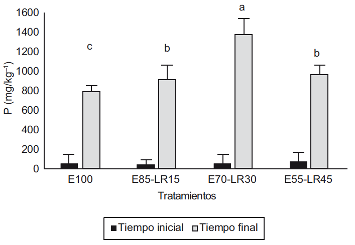 El contenido de P se incrementó en todos los tratamientos al final del vermicomposteo, presentando diferencias significativas (p < 0.05; Fig. 7) en el siguiente orden: E70-LR30 (1369.8 ± 114.8 mg/kg) > E55-LR45 (967.7 ± 99.0 mg/kg) > E85-LR15 (911.7 ± 25.2 mg/kg) > E100 (795.5 ± 29.2 mg/kg). Es posible que el incremento del fósforo se deba a que durante el proceso de vermicomposteo, la MO es degradada en el intestino de la lombriz y su degradación da como resultado compuestos fosfatados alcalinos que están disponibles y que son parte de las heces de la vermicomposta (Suthar 2009, Hait y Tare 2011, Bhat et al. 2015).
