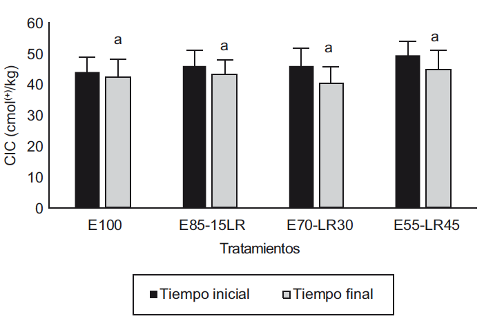 La capacidad de intercambio catiónico es la que se tiene para retener y liberar iones positivos y en todas las vermicompostas disminuyó con el paso del tiempo. Este comportamiento puede deberse a la pérdida de la materia orgánica a lo largo del proceso (Fig. 8). Sin embargo no se mostraron diferencias entre los tiempos de medición inicial y final (p < 0.05).