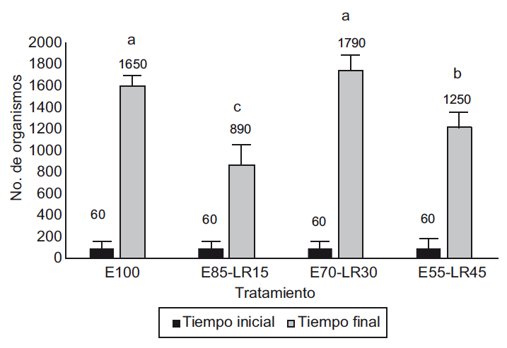 El número de lombrices en un sistema depende de las condiciones ambientales como temperatura, humedad, densidad y tipo de lombriz, además de las características de los residuos (Hait y Tare 2011) y está relacionado directamente con la disponibilidad de alimento. En este experimento se partió de 60 organismos de la especie E. fetida que se adicionaron a cada mezcla, al final del proceso de vermicomposteo (90 días) se contaron los organismo por cada tratamiento. El orden ascendente fue el siguiente: E70-LR30 (1790 organismos) > E100 (1650 organismos) > E55-LR45 (1250 organismos) > E85-LR15 (890 organismos (Fig. 9) mostrando diferencias significativas entre los tratamientos. Se observa entonces que E70-LR30 presentó la mejores condiciones para el desarrollo y reproducción de E. fetida.