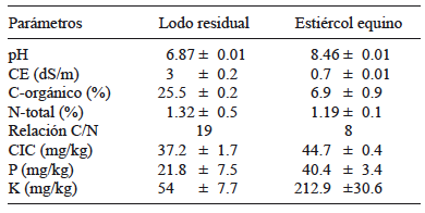 El estiércol equino presentó un alto contenido de carbono orgánico (6.9 %) con respecto a lo que reportan Gogoi et al. (2015) que es de 3.5 %. Para el LR, el C orgánico (25.5 %) presentó valores similares a los estudiados por Hait y Tare (2011) con 27.3 %.