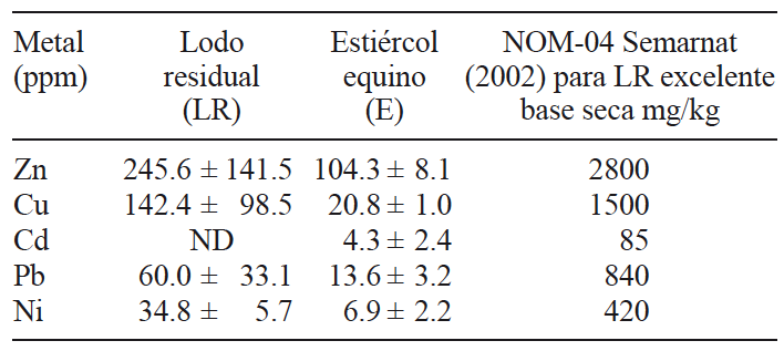 El contenido de MP se observa en el cuadro II. En este caso, el LR se clasifica como un acondicionador excelente para su uso en la agricultura de acuerdo con las concentraciones máximas permitidas para la disposición final de lodos residuales y biosólidos como establece la norma oficial mexicana NOM-004-SEMARNAT-2002 (SEMARNAT 2002). Sangwan et al. (2008) reportan valores de metales para el estiércol equino muy por encima de los encontrados en este estudio: Cu total, 83 ± 12 mg/kg; Zn total, 841 ± 53 mg/kg; Ni total, 393 ± 37 mg/kg.