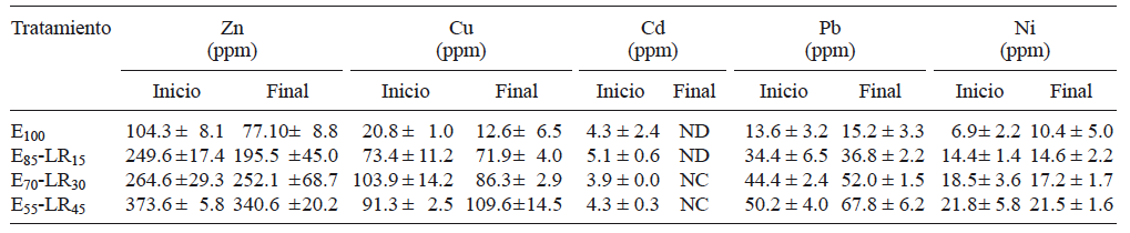 En contraste, el Pb, muestra una tendencia a incrementar al final del proceso, sobre todo en los tratamientos E70 LR30 y E55 LR45. Los incrementos de metales como Cu y Zn han sido explicados por Lukkari et al. (2006), quienes afirman que la unión de estos elementos a la materia orgánica reducen su disponibilidad. Los incrementos también podrían deberse a la selección de las lombrices de tierra y al consumo de residuos orgánicos para lograr una nutrición adecuada. Esto se debe a que las lombrices de tierra promueven condiciones microclimáticas que aumentan la pérdida de carbono orgánico a través de sus mecanismos de alimentación y de la degradación microbiana y por lo tanto se concentran aún más los metales pesados en las vermicompostas (Bakar et al. 2013).