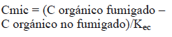 Para la determinación del Cmic se empleó el método de fumigación-extracción según Vance et al. (1987) que estima este indicador como el contenido de carbono soluble en una solución de K2SO4 0.5 M. Para ello se utilizaron muestras de 5 g de suelo a 50 % de su capacidad de campo, por sextuplicado para cada serie de tiempo. Tres réplicas se fumigaron con cloroformo libre de etanol en una cámara de vacío por 24 h con el fin de provocar la muerte de las células microbianas, mientras que las tres réplicas restantes no fueron fumigadas. El carbono de las muestras fumigadas y no fumigadas se extrajo con 40 mL de K2SO4 0.5 M agitando durante 1 h. Posteriormente se tomaron 8 mL del extracto y se añadieron 15 mL de una mezcla ácida (2/3 partes de H2SO4 y 1/3 de H3P04), 2 mL de K2Cr2O7 66.7 mM y 70 mg de HgO. La mezcla se colocó a digestión durante 30 min a 150 ºC y luego se valoró con sulfato amónico ferroso 33 mM empleando como indicador 1.10 fenantrolina-ferrosa 25 mM. La cantidad de carbono de la biomasa microbiana se determinó mediante la fórmula: