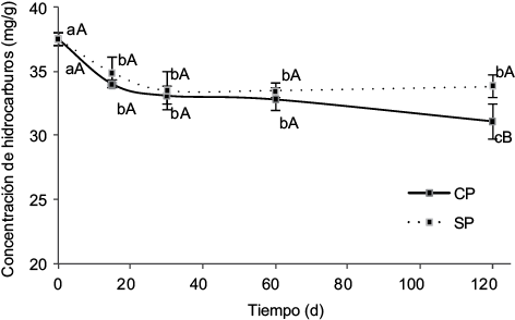 Durante los 120 días del ensayo, el valor inicial de 37.5 mg/g de hidrocarburos disminuyó a 33.8 mg/g en SP y 31.1 mg/g en CP, siendo estadísticamente diferentes entre sí sólo a los 120 d (Fig.1). La mayor disminución del contenido de hidrocarburos en los primeros 15 d para ambos tratamientos se relaciona con la rápida degradación de los componentes más lábiles, como son los saturados y los aromáticos, las fracciones más biodegradables, pero también más toxicas respecto a las resinas y asfaltenos (Ehrmann et al. 2009, Infante y Morales 2012). Posteriormente, a partir de los 15 d y hasta el término del ensayo, el tratamiento SP no evidenció una reducción significativa en el contenido de hidrocarburos.