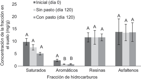 De las fracciones que componen el hidrocarburo extra pesado, disminuyeron las de saturados y aromáticos para el tratamiento con pasto y sólo la de aromáticos para el tratamiento sin pasto, el resto de las fracciones no mostraron cambios significativos, lo cual se asocia a su reconocida baja biodegradabilidad.