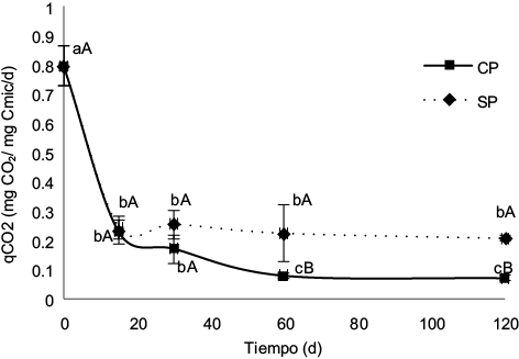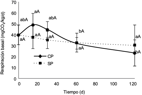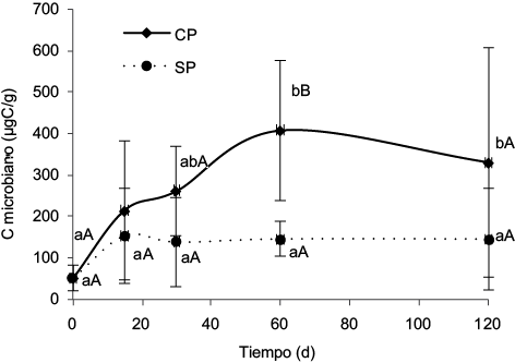 El contenido de carbono de la biomasa microbiana no mostró diferencias entre tratamientos los primeros 30 d. Posteriormente, en CP acusó un incremento a los 60 y 120 d, pero sólo a los 60 d, el carbono de la biomasa microbiana fue superior al registro de SP. Por otra parte, SP se mantuvo sin cambios significativos durante el desarrollo de los experimentos (Fig. 4).