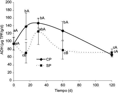 La actividad de la enzima deshidrogenasa (ADH) mostró un pico para CP y SP a los 30 d (Fig. 6). Sin embargo sólo se encontraron diferencias significativas entre tratamientos a los 15 y 60 d, siendo mayor la ADH en CP. El incremento de la ADH los primeros 30 d se asocia al aprovechamiento del carbono del petróleo, especialmente aquellas fracciones más biodegradables como los aromáticos y los saturados. Posteriormente, a partir del día 60, con la reducción de las fracciones más biodegradables y la persistencia de las formas más recalcitrantes de los hidrocarburos, disminuyó la actividad de la enzima deshidrogenasa. Mager y Hernández Valencia (2013), señalan un comportamiento similar para la misma especie, pero en suelos contaminados con petróleo liviano.