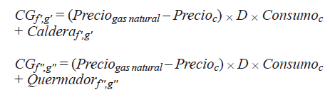 Estos dos últimos costos dependen del precio del combustible que se sustituye y el precio del gas natural, además del costo anualizado de la caldera (Calderaf',g') o quemador dual (Quemadorf'',g'') que se requiera instalar. Las fórmulas para ambos costos son las siguientes, siendo c el combustible que se va a sustituir por gas natural: