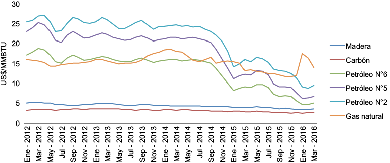 Por otra parte, si las fuentes deciden realizar la sustitución de combustible, además de la inversión en calderas, deben enfrentar un diferencial de costos de operación asociado al diferencial del precio del combustible actual respecto al precio del gas natural. Tal como se aprecia en la figura 1 los precios (en millón de BTU, MMBTU) de la mayoría de los combustibles han evolucionado de forma similar a través del tiempo. Sin embargo, en los últimos años, a diferencia de la tendencia internacional en el mercado de los combustibles, el precio del gas natural ha tenido un comportamiento distinto debido a las restricciones de oferta que son particulares a la zona de estudio.