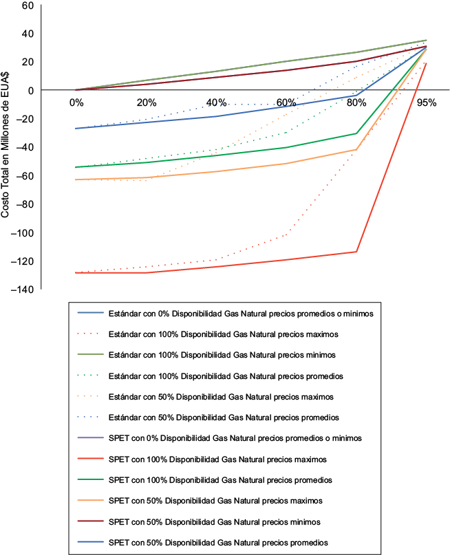 Al igual que en el caso anterior, con un estándar de emisiones se observa que si existiera una mayor disponibilidad de gas natural, los costos disminuirían llegando en algunos casos a generar ahorro de costos pero sólo hasta metas de 60 % de reducción. Por otra parte, se observa que mientras aumenta la meta de reducción son mayores los costos, llegando a 34.6 millones de dólares cuando la meta es de un 95 % y no existe disponibilidad de gas.