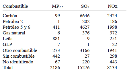 Las fuentes industriales que consumen leña y carbón aunque son menos numerosas comparadas con las que consumen petróleo, generan la mayor cantidad de emisiones de los contaminantes bajo estudio. El 40.3 % de las emisiones de material particulado fino son generadas por fuentes que ocupan leña como combustible. El 45.5 % de las emisiones de SO2 son generadas por las fuentes que consumen carbón, las cuales también emiten un 29.8 % de las emisiones de NOX. Además, las fuentes que utilizan petróleo núm. 5 y núm. 6 tienen una presencia importante en las emisiones de los contaminantes considerados (18.8 % de las emisiones de MP2.5, 30.3 % de las emisiones de SO2 y 24.6 % de las emisiones de NOX).