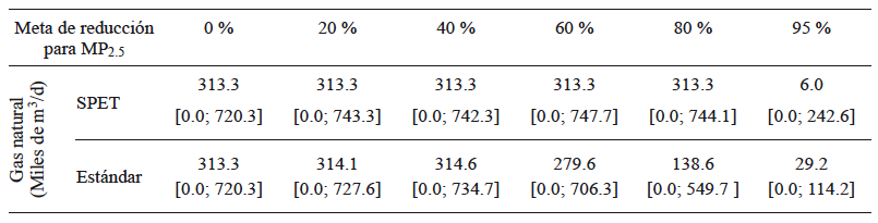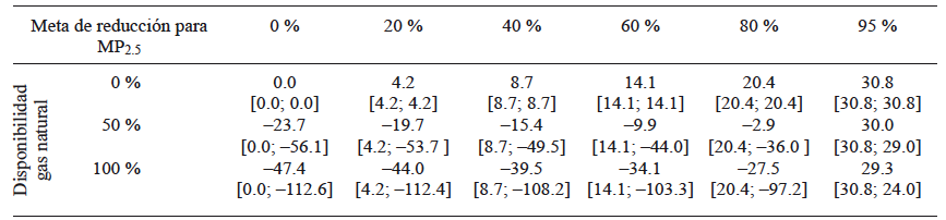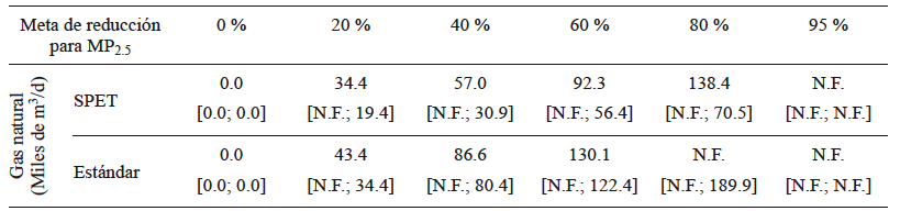 En el cuadro VI se observa que al aumentar la disponibilidad de gas natural los costos totales del SPET disminuyen. Además, para regulaciones que exijan hasta 80 % de reducción de emisiones de MP2.5 se obtendría un ahorro de costos, el cual se genera porque el precio promedio del gas natural en MMBTU es más bajo que el precio del petróleo núm. 2 y núm. 5. En consecuencia, ante una eventual mayor disponibilidad de gas natural las fuentes industriales que utilizan estos dos combustibles líquidos se cambiarían incluso sin exigencia de regulación. El ahorro máximo ocurre cuando existe un 100 % de disponibilidad de gas sin exigencia de reducción, llegando a 47.4 millones de dólares americanos. Con una meta del 95 % de reducción los costos totales del SPET con o sin disponibilidad de gas son similares y cercanos a los 30 millones de dólares, ya que para esa meta de reducción la sustitución de combustible no es una opción factible y las fuentes industriales deben optar por tecnologías de abatimiento.