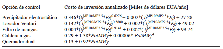 Las funciones de costo para cada tecnología de abatimiento, que dependen de las emisiones de cada fuente (Ef) y de la tasa de emisión entre MP10 y MP2.5 (tfMP10/MP2.5), son las mismas utilizadas por Mardones y Jiménez (2015). Por otra parte, Mardones et al. (2015) reportan una función de costo anualizado para la instalación de una caldera a gas natural y una función de costo anualizado para la instalación de un quemador dual, las cuales dependen de la potencia de la caldera (PotMWf) (Cuadro II).