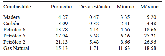Debido a que la decisión de adoptar nuevas tecnologías de abatimiento o sustitución de combustible es una evaluación de largo plazo, se decide utilizar el precio promedio de los combustibles de los últimos cinco años para realizar las simulaciones de los escenarios regulatorios y, además, para reflejar la variabilidad en estos precios también se presentan los resultados de las simulaciones considerando los precios mínimos y máximos en el periodo analizado (Cuadro IV). Cabe notar que en las simulaciones se sensibilizaron los precios del gas natural y también el precio de los otros combustibles debido a la alta correlación que presentan cuando están en valores máximos o mínimos.