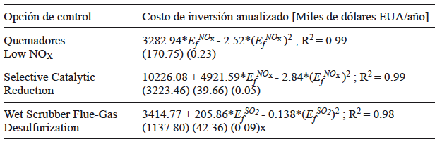 A partir de los manuales de la Agencia de Protección Ambiental de Estados Unidos (USEPA 2009) y de estudios técnico económicos se recopiló información sobre costos anualizados de quemadores: bajos en NOx-low NOX (LNB) y de reducción selectiva catalítica-selective catalytic reduction (SCR). Ambas tecnologías permiten la reducción de emisiones de NOX, así como los sistemas de desulfuración de gases de combustión-wet scrubber flue-gas desulfurization (FGD) que permiten reducir emisiones de SO2. Luego, se relacionaron los costos anualizados para diferentes niveles de reducción de emisiones, obteniendo las estimaciones para las funciones de costos que se presentan en el cuadro V.