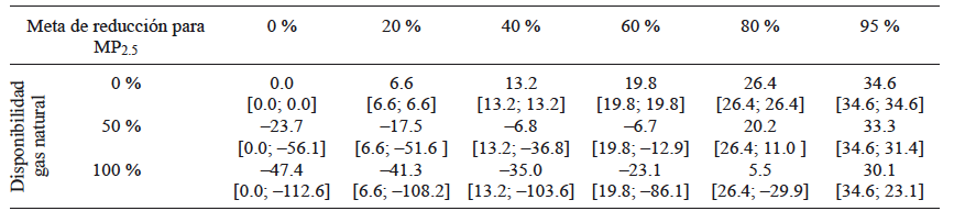 Cuando existe disponibilidad de gas natural para los requerimientos energéticos de todas las fuentes emisoras que actualmente utilizan combustibles líquidos o sólidos el ahorro es de 6.4 millones de dólares americanos por reducción de SO2 y NOX, incluso sin necesidad de regulación. Estos ahorros de costos se pueden sumar a los generados directamente por la reducción de MP2.5, ya sea bajo una regulación de SPET o un estándar de emisión. Los resultados revelan que al considerar las externalidades se podrían reforzar los argumentos para justificar subsidios e incentivar el suministro de gas natural en zonas urbanas industriales con problemas de contaminación por material particulado fino.