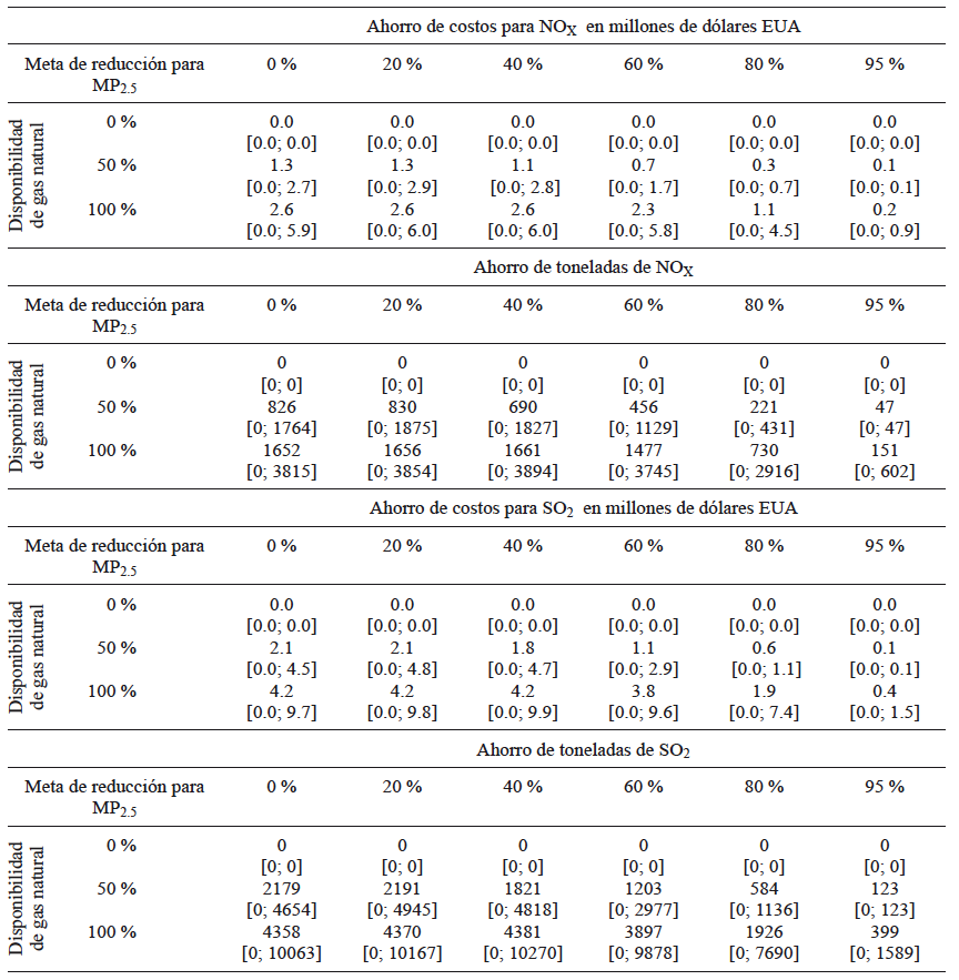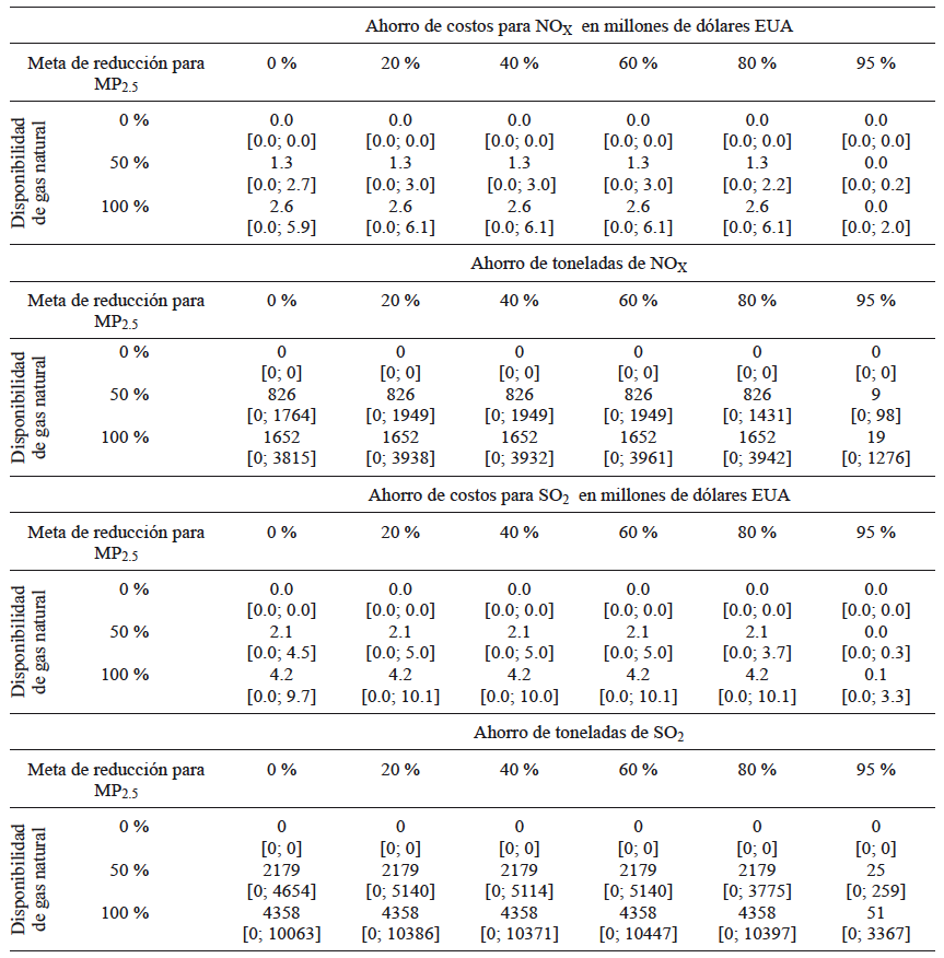 Bajo una disponibilidad de 100 % de gas natural y metas de reducción hasta 80 %, las emisiones de SO2 se ven reducidas en 4358 toneladas, lo que representa un 28.5 % de las emisiones totales de este contaminante según el inventario de emisiones, con un ahorro potencial de 4.2 millones de dólares. Para los mismos escenarios las emisiones de NOX se ven reducidas en 1652 toneladas, que representan un 20.3 % de las emisiones totales de este contaminante, con un ahorro de 2.6 millones de dólares. Sin embargo, si en las simulaciones se utilizan los precios mínimos, estas externalidades positivas desaparecen ya que las fuentes no sustituirían sus combustibles más contaminantes. Por el contrario, si se utilizan los precios máximos los beneficios económicos por reducción de SO2 y NOX se elevan a más del doble.