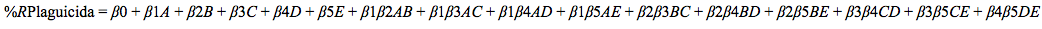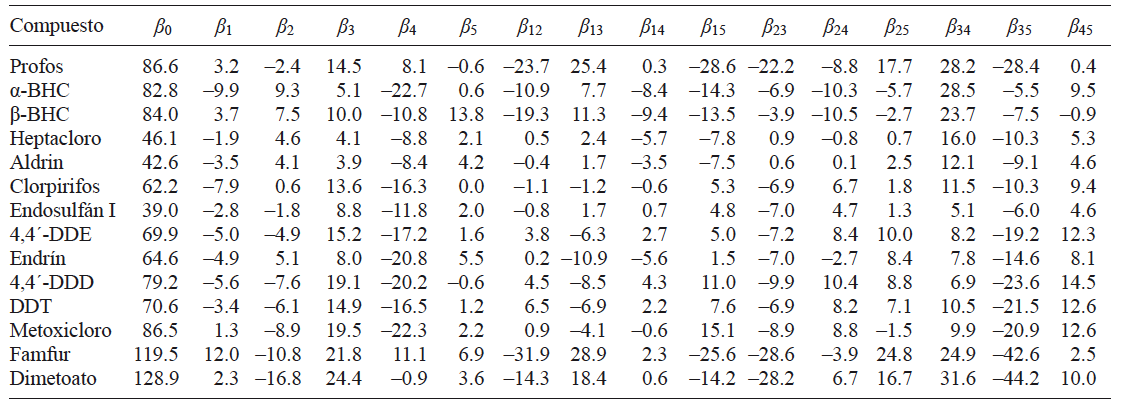 Con base en el cuadro VII se obtuvieron ecuaciones polinómicas de segundo orden, cuya estructura se muestra en la ec. 1, donde los porcentajes de recuperación de cada plaguicida (% RPlaguicida) se relacionan por medio de una ecuación lineal con cada uno de los factores de mayor influencia, determinados a través del diseño de tamizaje.