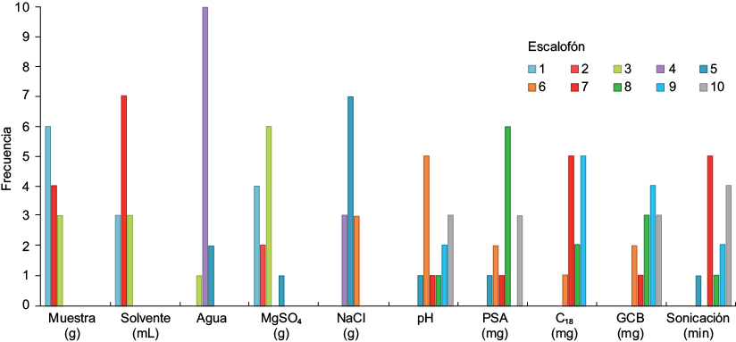 Para cada plaguicida, en el cuadro VI se presenta un compendio de los escalafones obtenidos para los parámetros evaluados del proceso de extracción. La distribución en un histograma que relaciona la frecuencia de aparición de los escalafones por factor, tomando en cuenta el total de plaguicidas analizados (Fig. 1), muestra de manera general qué factores tienen una influencia considerable. Se encontró que la cantidad de muestra, la cantidad de solvente y de sales de partición con escalafón entre 1 y 5, en su mayoría son los factores relevantes. Por otro lado, factores como el ultrasonido, el pH y el uso de absorbentes en el proceso de limpieza mostraron tener poco efecto, con escalafón entre 6 y 10.