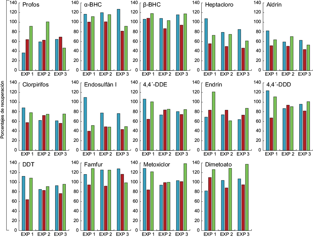 Como se muestra en la figura 2, en la mayoría de los casos los porcentajes de recuperación calculados teóricamente para cada plaguicida concuerdan con las recuperaciones obtenidas experimentalmente. La poca relación de algunos de los resultados es consecuencia de los errores inherentes no sólo en las recuperaciones obtenidas en los experimentos de evaluación, sino también en las incertidumbres de los datos usados en la construcción de los modelos. Asimismo, el efecto matriz propio de las evaluaciones cromatográficas puede ser parte de la variación en las mediciones (Erney et al. 1993).
