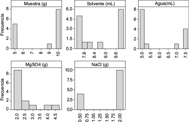 En el cuadro IX se muestran los valores óptimos obtenidos de cada factor para cada plaguicida. Relaciones 1:1 y 1:2 muestra:solvente, relaciones 2:1 muestra:agua, así como relaciones 2:1 y 1:1 MgSO4:NaCl, fueron encontradas como óptimas en el proceso de extracción. Debido a que no se detectó para todos los compuestos una uniformidad en las cantidades óptimas, se construyó un diagrama de frecuencias para determinar las cantidades de mayor frecuencia entre los plaguicidas para cada factor (Fig. 3). Los valores óptimos, fueron elegidos tomando en cuenta las cantidades de mayor frecuencia: 10 g de muestra, 10 mL de acetonitrilo, 5 mL de agua, 2 g de MgSO4 y 2 g de NaCl.