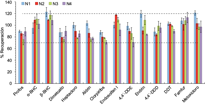 Para evaluar el método QuEChERS se determinó: linealidad, precisión, exactitud, límites de detección (LD) y límites de cuantificación (LC). Los resultados para cada uno de los parámetros evaluados se resumen en el cuadro X. Los rangos dinámicos lineales se obtuvieron en el intervalo de 10.2 a 258.6 μg/kg, los coeficientes de regresión (r2) superaron 0.990 para todos los analitos. El LD del método (con base en la relación S/N = 3) para los analitos seleccionados varió de 4.9 a 21.7 μg/kg y LC (con base en la relación S/N =10) de 9.9 a 38.4 μg/kg. El CV (%) de los procesos de extracción y determinación de los analitos fue en promedio 5.3 %. En la figura 4 se muestra el compendio de las evaluaciones de recuperación realizadas a las muestras fortificadas bajo cuatro diferentes concentraciones. En su mayoría, los porcentajes de recuperación calculados estuvieron entre 70 y 120 %, los cuales se consideran como aceptables dentro del análisis de residuos de plaguicidas en matrices ambientales (SANTE 2015).