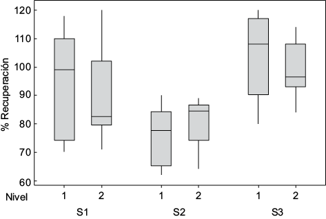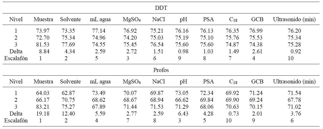Se utilizó la relación señal/ruido (S/N) como una medida de robustez que sirve para identificar el factor evaluado que minimiza el efecto de ruido sobre la respuesta (Gutiérrez y Salazar 2012). En el cuadro V se muestran las relaciones S/N para cada combinación de niveles de factor evaluados en el diseño correspondiente a dos de los plaguicidas estudiados (DDT, profos). En este caso se eligió la relación “más alto es mejor” que proporciona Minitab 16. Se muestra además dos parámetros: el valor delta, que mide el tamaño del efecto al tomar la diferencia entre el valor más alto y el valor más bajo de cada característica de respuesta (porcentajes de recuperación) y el escalafón, que ordena los factores del efecto más grande (con base en los valores delta) al efecto más pequeño sobre la característica de respuesta. Para los plaguicidas DDT y profos por ejemplo, la cantidad de muestra y solvente son dos factores importantes dentro del proceso (escalafón 1 y 2). En ambos casos, una cantidad de muestra de 10 g y de acetonitrilo (solvente) de 10 mL, arrojaron los mejores resultados.
