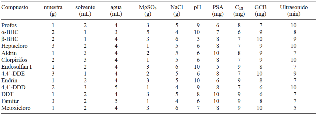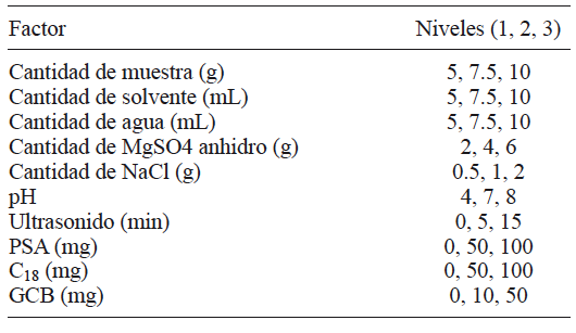 En el proceso de extracción se evaluaron el efecto de la cantidad de: 1) muestra, 2) solvente, 3) agua, 4) sales de partición y además 5) pH y 6) tiempo de aplicación de ultrasonido. En la limpieza de los extractos se evaluó el efecto de tres diferentes adsorbentes: PSA, C18 y GCB, manteniendo constante la cantidad de sulfato de magnesio (600 mg/mL de extracto). Se tomó como respuesta del sistema los porcentajes de recuperación de cada uno de los plaguicidas obtenidos en las 27 corridas del diseño.