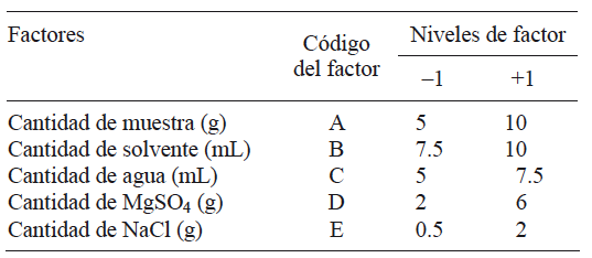Un diseño factorial fraccionado (media fracción), con cinco factores, resolución V y 16 corridas se usó como segundo método de verificación de la influencia de los factores en el proceso. Los factores investigados en el diseño 25-1 factorial fraccionado se muestran en el cuadro III. Se usaron dos niveles, los valores altos y bajos para cada factor se basan en el análisis del diseño Taguchi y se denotan como -1 y +1 en unidades codificadas.
