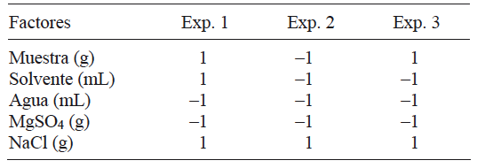 El diseño experimental Taguchi fue seleccionado para investigar el efecto de diferentes factores en la recuperación de plaguicidas en las muestras fortificadas. El método DOE con Taguchi de matriz ortogonal es un enfoque basado en un factorial que fusiona técnicas estadísticas y de ingeniería y facilita el estudio del sistema por un conjunto de variables independientes (factores), tanto controlables como incontrolables (dinámico/ruido), sobre una región específica de interés (niveles). En este diseño se emplea un número mínimo de ensayos, se ahorra tiempo, recursos y los resultados obtenidos son insensibles a los cambios ambientales y otros factores de ruido (Taguchi 1987, Venkata Mohan et al. 2007, Gutiérrez y Salazar 2012). Se implementó un diseño Taguchi ortogonal L27 con 10 factores, cada uno a tres niveles. Los factores y los niveles de cada uno se muestran en el cuadro II. La secuencia de las corridas (27) fue aleatoria para reducir el sesgo. Las cantidades evaluadas en cada factor fueron elegidas como consecuencia de una revisión bibliográfica del proceso de preparación de muestras QuEChERS (Asensio-Ramos et al. 2010, García et al. 2010, Bragança et al. 2012, Correia-Sá et al. 2012, Rouvière et al. 2012).