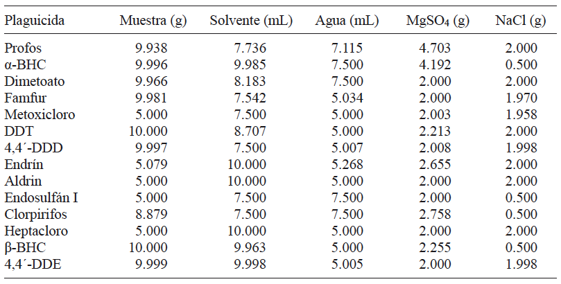 Se estudiaron 14 plaguicidas: cuatro organofosforados (profos, dimetoato, famfur y clorpirifos) y 10 organoclorados (alfa-hexachlorociclohexano (α-BHC), beta-hexaclorociclohexano (β-BHC), metoxicloro, dicloro difenil tricloroetano (DDT), 1,1-dicloro-2,2-bis(4-clorofenil)eteno (4,4´-DDE), 1,1-dicloro-2,2-bis(4-clorofenil)etano (4,4´-DDD), endrín, aldrín, alfa-endosulfán y heptacloro). Todos los estándares de plaguicidas se adquirieron en Chem Service y Dr. Ehrenstorfer con una pureza superior al 98 %. Se prepararon 10 mL de una mezcla concentrada (solución madre) a 500 mg/L de cada uno de los plaguicidas. Para ello, se tomó aproximadamente 5 mg de cada estándar y se redisolvieron con hexano:acetona en una relación 80:20. Adicionalmente, se prepararon 25 mL de una solución de trabajo a 5 mg/L con 250 µL de la solución madre.