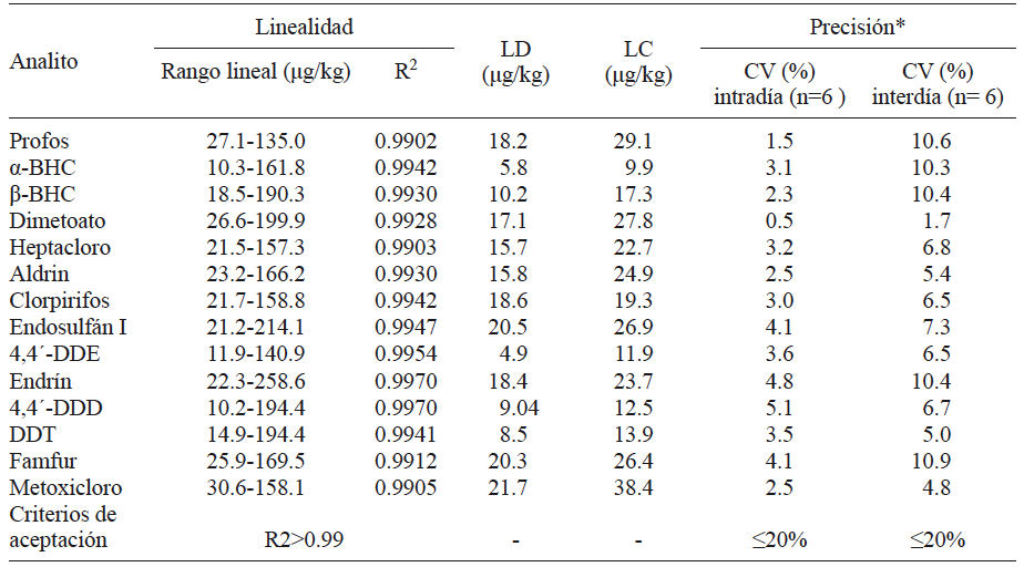 Dentro de los parámetros de calidad analítica del método extractivo e instrumental, se determinó el rango lineal y dinámico de análisis (r2 ) a través de curvas de calibración en matriz, preparadas a partir de extractos orgánicos obtenidos de muestras de suelo libre de plaguicidas. La cuantificación se realizó por el método de calibración externa. La precisión de la metodología extractiva se verificó al calcular el coeficiente de variación (CV) de los porcentajes de recuperación promedio en diferentes días (precisión interdía) y los análisis realizados en un mismo día (intradía), fortificando muestras de suelo de referencia bajo dos niveles (40 y 80 µg/kg).