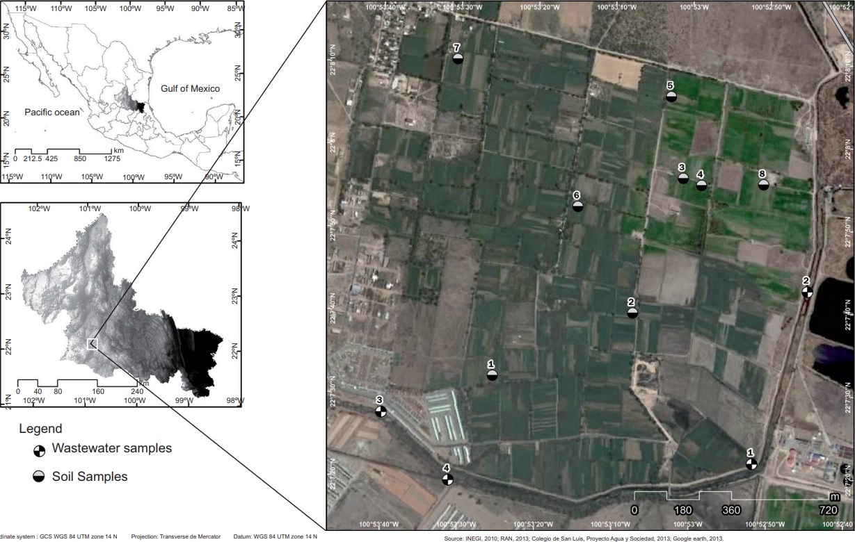 The study area is located in a narrow plain (1850 y 1900 masl) nearby the city of San Luis Potosí, in a semiarid region of Mexico (Fig. 1). The predominant soils in the study area are: haplic xerosols combined with rendzinas, haplic phaeozems and leptosols. All of them have characteristics, which combined with climatic conditions (low rainfall, high evaporation, low humidity, etc.), limit agricultural productivity. To compensate for the low SOM contents, the use of compost or wastewater is usually carried out on agricultural plots. Wastewater irrigation in this area is common since 1920 (Cirelli 2004) and it is considered an important nutrient source, which can augment soil productivity (Salazar-Ledesma 2011). Irrigation wastewater is pumped from the Españita river, now a collector for domestic and industrial wastewater from the city of San Luis Potosí.