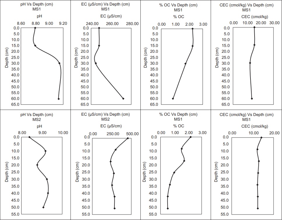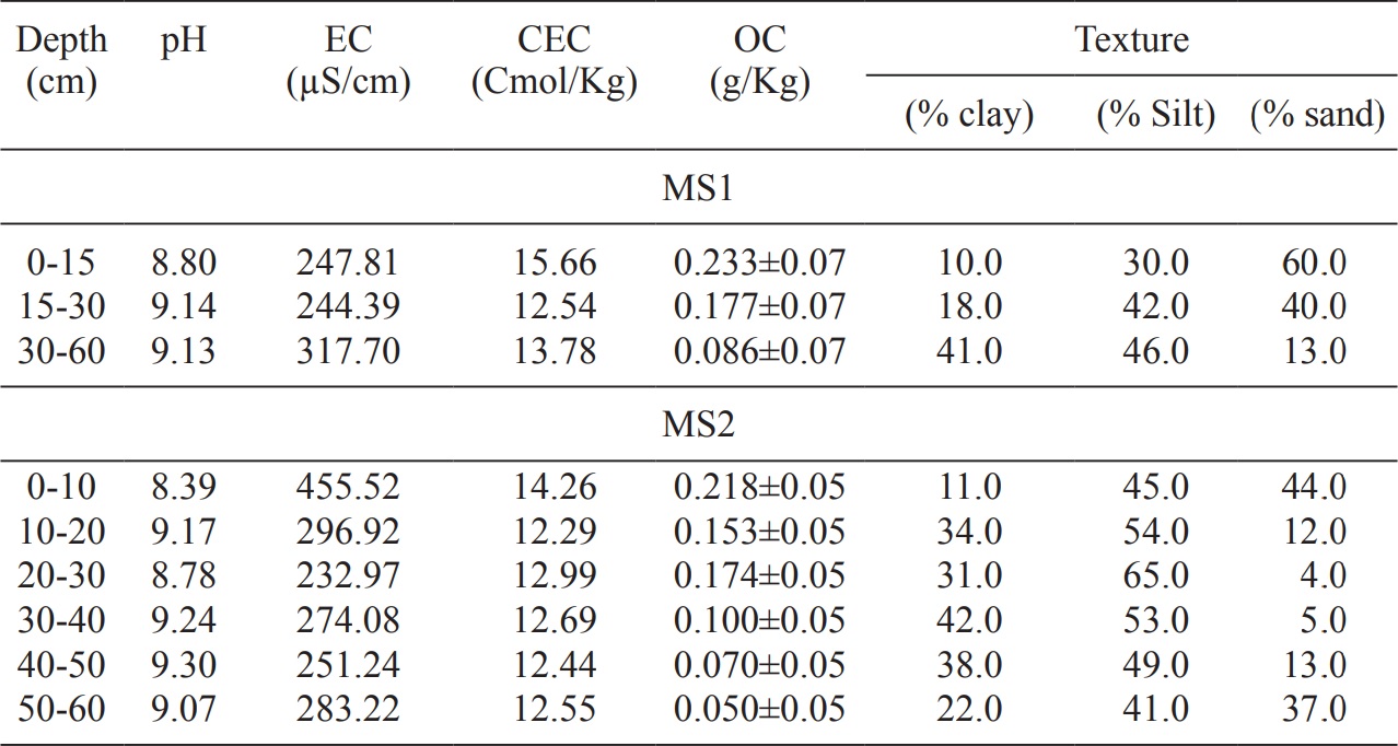 The soil profile pH was 8.39-9.24, the 0-20 cm layer was in the slightly alkaline range (7.4-8.5) while the 20-60 cm layer was highly alkaline (pH > 8.5; Table IV). EC either augmented with depth (sample MS1: 247.81-317.70 µS/cm) or diminished (sample MS2: 455.52-283.22 µS/cm; Fig. 2). EC value ranges were low in both depths, denoting a non-saline soil. Bot and Benites (2005), report that salinity and extremes in soil pH (acid or alkaline) result in poor biomass production and thus, in reduced additions of organic matter to the soil, consistent with data reported in this study.