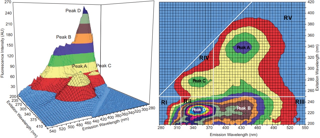 The EEM permits the analyses of spectral properties and thereby identification of the components of an unknown mixture of fluorophores. It uses multiple λem and λexc with different intensities to find the total luminescence (Boehme et al. 2004). Integration under the EEM volume used five excitation-emission regions (Chen et al. 2003).