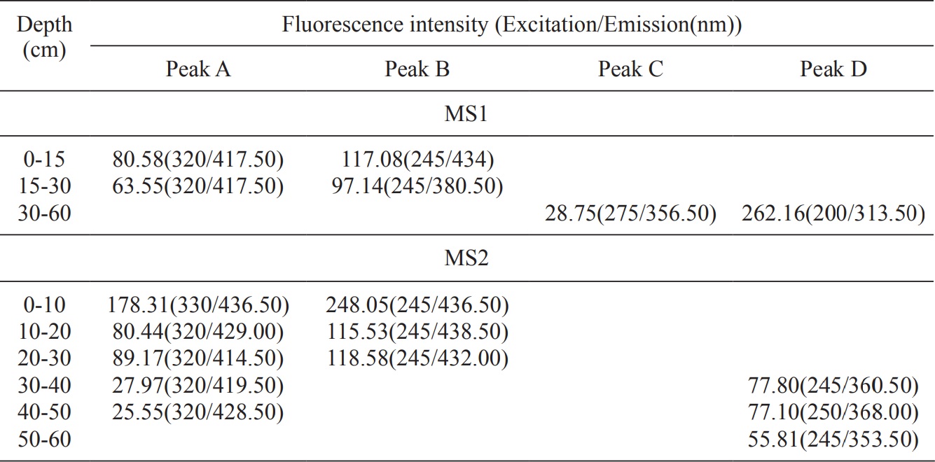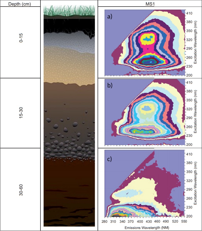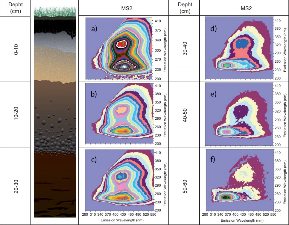 DOM in sample MS2 was related to humic acids (peak A) and fulvic acids (peak B) at a 0-30 cm depth, and aromatic proteins (peak D) at 30-60 cm depth. Peak A remained through the whole profile and peak B was present only at 0-30 cm depth. Peak D appeared at 30-60 cm. A shift in MS1 and MS2 spectra at 0-30 cm depth, absent in MS1 at 30-60cm, was observed at 220 nm, the wavelength at which nitrogen absorbs light. This suggested recent fertilization (Fuentes Rivas et al. in press). If nitrogenous species concentration, such as nitrates are high, it is possible to observe a displacement in the fluorescence spectrum at 220 nm emission wavelength, the wavelength of nitrogen absorption, and this can be indicative of recent fertilization or organic matter mineralization.