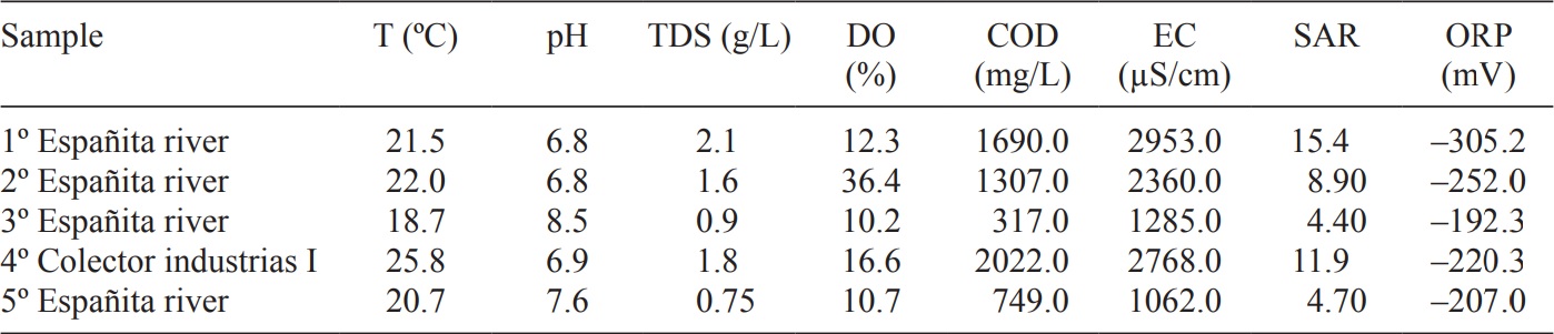 Five composed water samples were taken from the Españita river (Fig. 1). Field parameters were measured for each sample: temperature (T), pH, dissolved oxygen (DO), total dissolved solids (TDS), electric conductivity (EC) and oxidation-reduction potential (ORP). In the laboratory of the Comisión Nacional del Agua (National Water Commission), major anions and cations were also determined: chlorine (Cl–), sulfate (SO42–), nitrate (NO3–), nitrite (NO2–) and ammonium (NH4+) as well as chemical oxygen demand (COD).