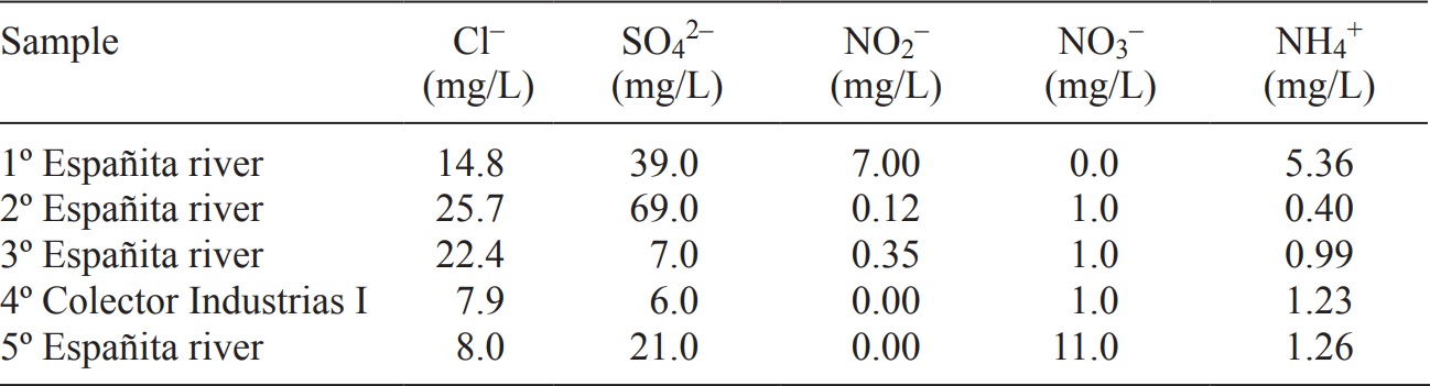 In the vicinity of discharges into the Españita river collector, pH was slightly acid, dissolved oxygen was low and redox potential was negative. This reducing conditions may explain the low concentrations of phosphates, sulfates and nitrogenous species such as nitrates.