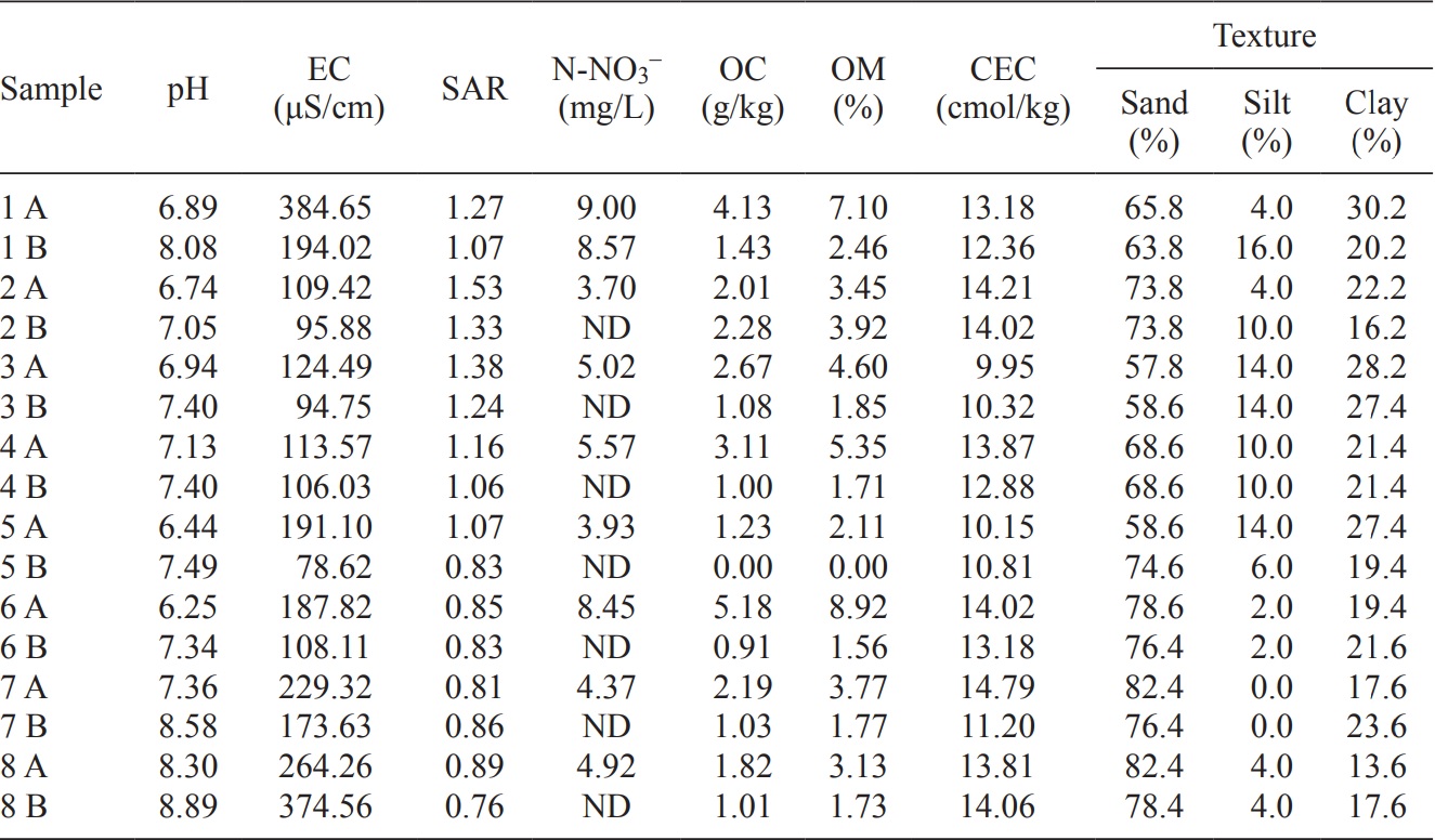 EC (78.62-384.65 μS/cm) and SAR (0.76-1.53) in the soil profiles showed no salinity or sodicity conditions (Table III), but rather normal soils as per the USDA classification (USDA 2015). This seemed linked to adequate drainage given by sandy-loam and loamy-sand textures, which may considerably diminish the effects of salinity added by wastewater. This was favorable considering that irrigation is linked to salt concentrations in (semi) arid agricultural areas (Walker and Lin 2008). In the valley of San Luis Potosi there is low rainfall, the annual average is 358 mm/year and the actual evapotranspiration is 347 mm/year, which correspond to 97.5 % of total precipitation (Carranco-Lozada et al. 2016).