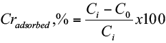 The amount of Cr (VI) adsorbed by the sawdust and the percentage removal of Cr (VI) were calculated using the following equations (1) and (2), respectively: