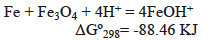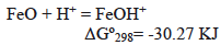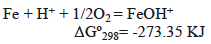 The reaction represented in equation 14 occurs preferably at a low pH, while the reaction indicated by equation 15 occurs at a higher pH range. In our case (pH = 3), anion HCrO4- can be absorbed by the positive charged surface due to the product reaction of equation (14). Then, iron zero valent-magnetite-wustite particles from BFD may adsorb either negatively or positively charged species by electrostatic attraction depending on pH of the solution. From the measured zeta potential of BFD at different pH values, the isoelectric point (IEP) value of the used material was 5. Then, at low pH (synthetic and industrial solutions pH = 3), the iron phases observed in table II react with the chromium acid solution to form FeOH+ in the BFD particle surface, according to the following reactions, where Gibbs free energies were calculated from HSC Chemistry software V5.1 (Roine 2002):