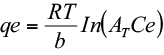 The Tempkin isotherm contains a factor that explicitly takes into account adsorbent-adsorbate interactions. The model assumes that heat of adsorption (function of temperature) of all molecules in the layer would decrease linearly rather than logarithmic with coverage (Tempkin and Pyzhey 1940, Aharoni and Ungarish 1977). The model is given by the equation 10. From plotting the quantity sorbed qe vs ln Ce, the constants are determined from the slope and intercept.