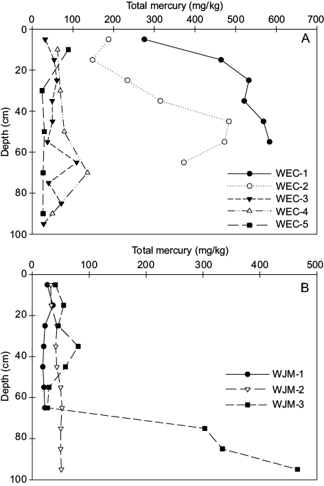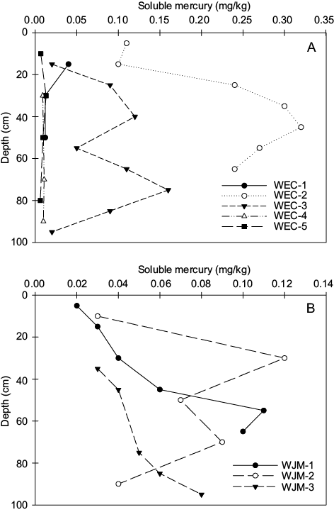 The depth-dependent variations in the concentrations of soluble Hg in the mining wastes showed clear differences among the sample sites (Fig. 4). Thus, the sample areas with lower soluble Hg concentrations (WEC-1, WEC-4 and WEC-5) showed low variation with depth. This trend was also observed in WJM-3, except for a small increase in the soluble Hg concentrations in the deeper sections. The samples from sites WEC-2, WEC-3, WJM-1 and WJM-2 had a noticeable peak of soluble Hg concentrations in the middle and deeper sections of the mining waste profiles.